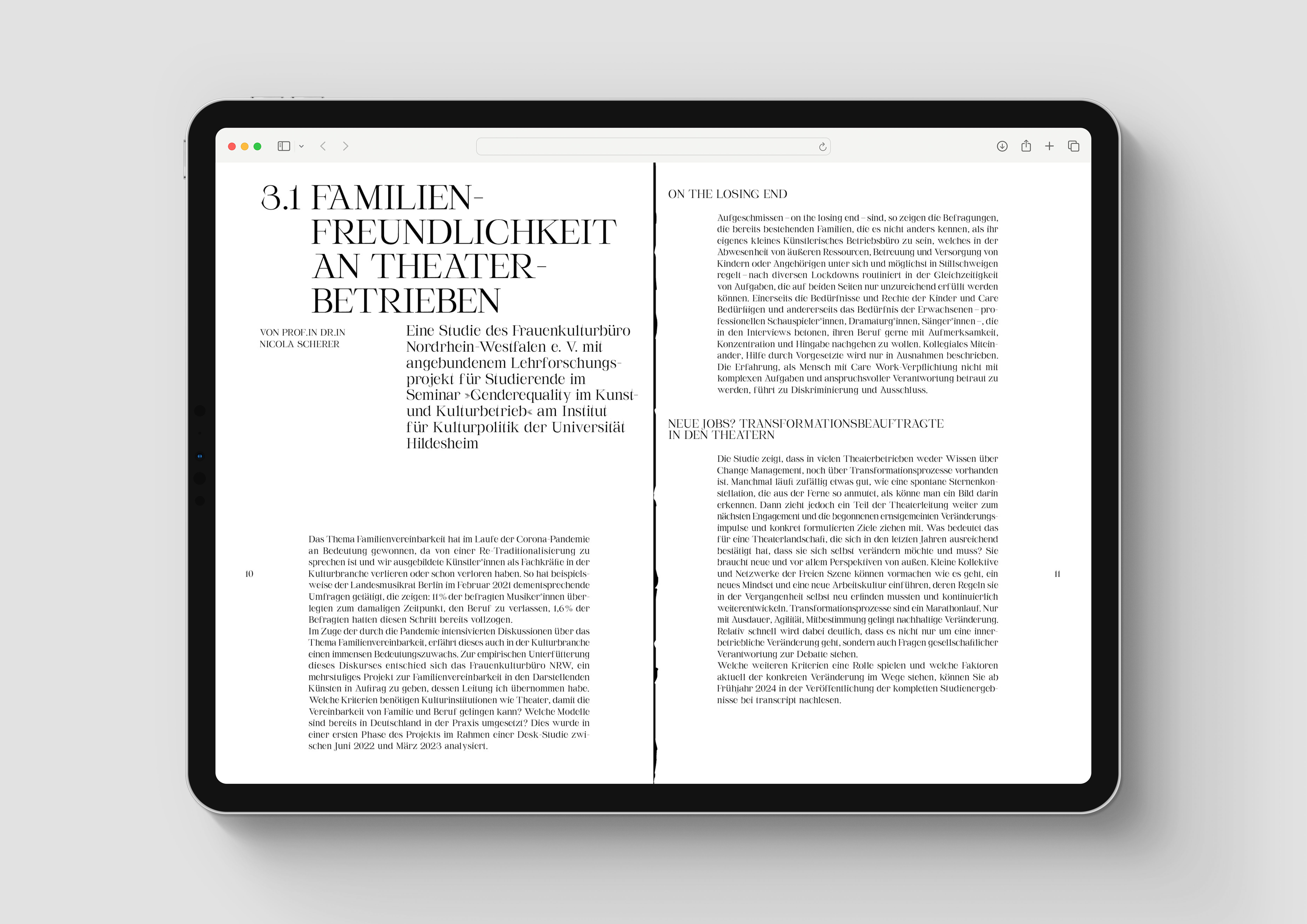 In six events, various fields and aspects of gender inequality will be described - from the compatibility of theatre and care work, to management and work models and financial inequality, to dealing with sexual assault and finally an artistic outlook on a gender-equitable drama canon and new aesthetics. Together with guests from research and practice, also from professions outside the theatre, structures will be analysed and current conditions described.