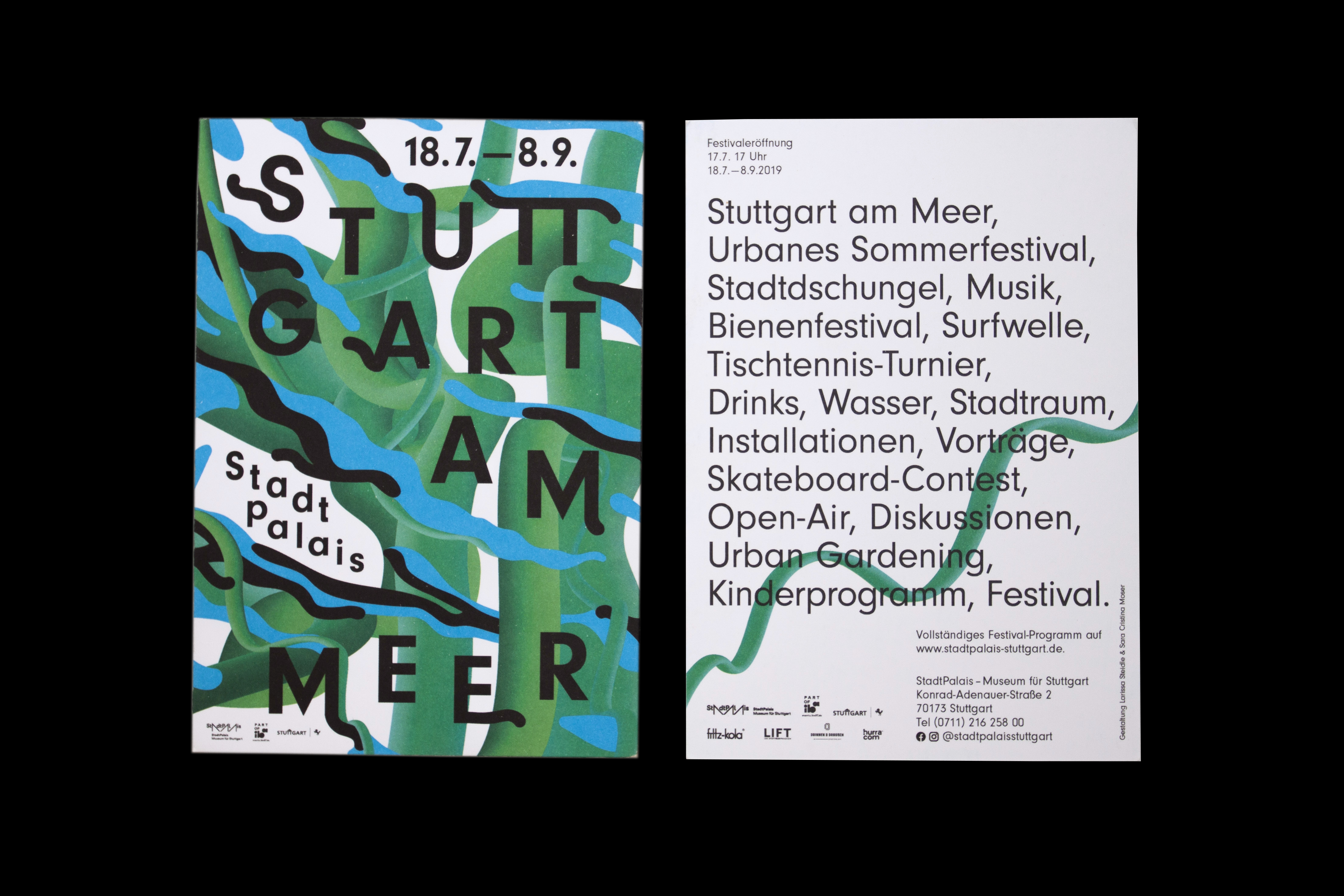 Konzept und Gestaltung in Kooperation mit Larissa Steidle für „Stuttgart am Meer“, das urbane Sommerfestival im Museum StadtPalais Stuttgart. Das Plakat basiert auf einem multifunktionalen Konzept, welches auf die verschiedenen Druck Medien von Flyer bis zum Verkehrsbus angewandt wurden, sowie auf den öffentlich Raum durch die Adaption des Motivs auf einen urbanen Outdoor Pool und über das Museumsgelände verteilte Aufsteller.